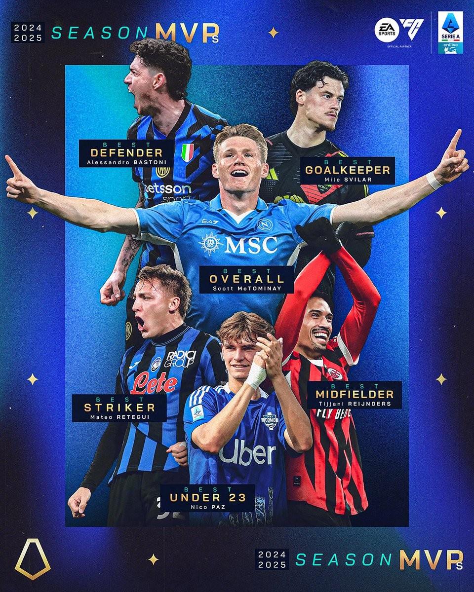 北京时间5月24日,在那不勒斯赢得队史第四座意甲冠军之后,意甲官方也公布2024-25赛季各项最佳球员的归属,除了此前已经公布的麦克托米奈赛季MVP、巴斯托尼最佳后卫以及尼科-帕斯最佳U23球员以外,斯维拉尔、赖因德斯以及雷特吉也同样上榜。
