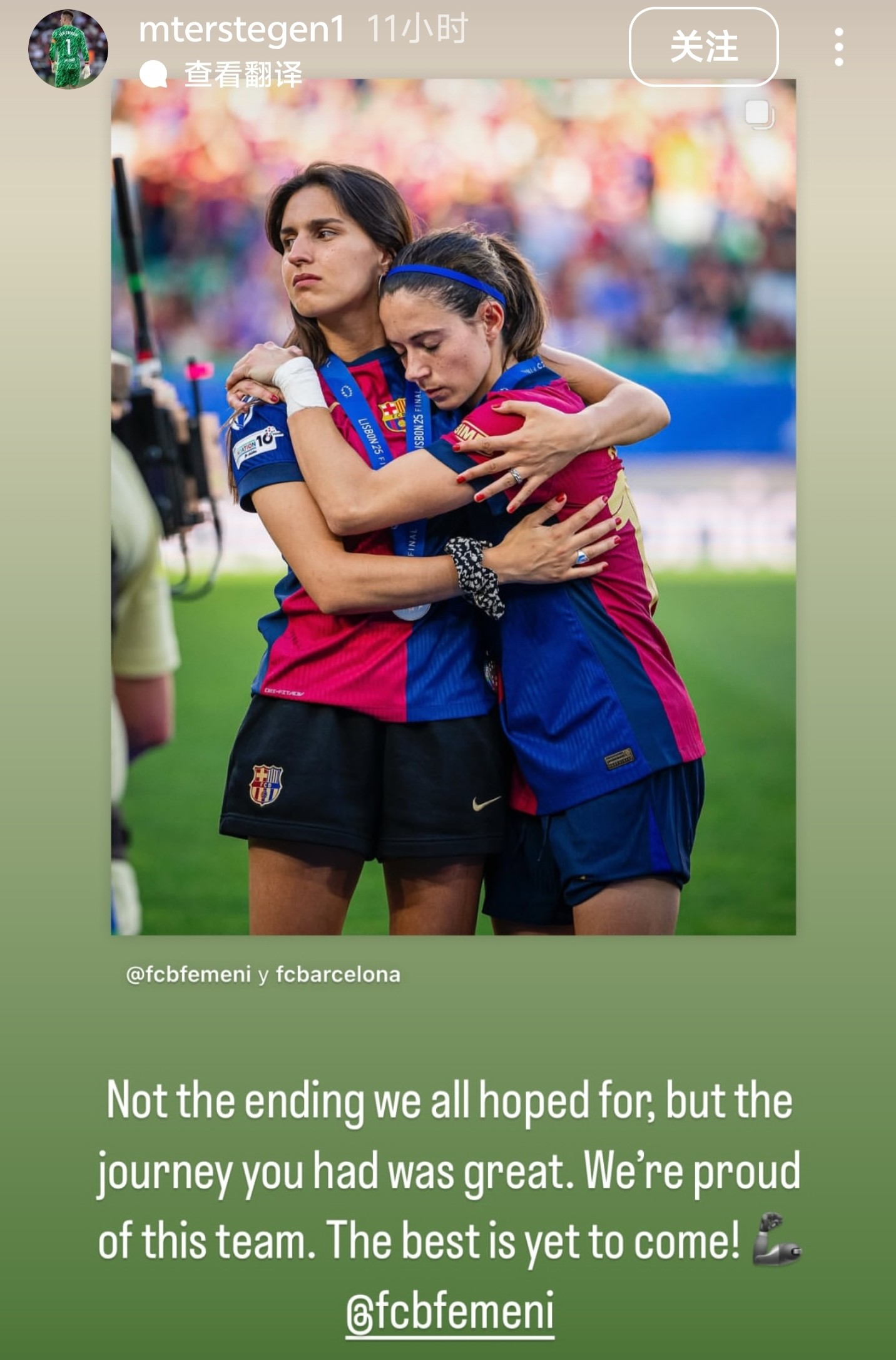 北京时间5月25日,本赛季女足欧冠决赛,巴萨女足0-1不敌阿森纳女足无缘冠军。赛后巴塞罗那门将特尔施特根也是在个人社交媒体上安慰失落的俱乐部女足将士们。