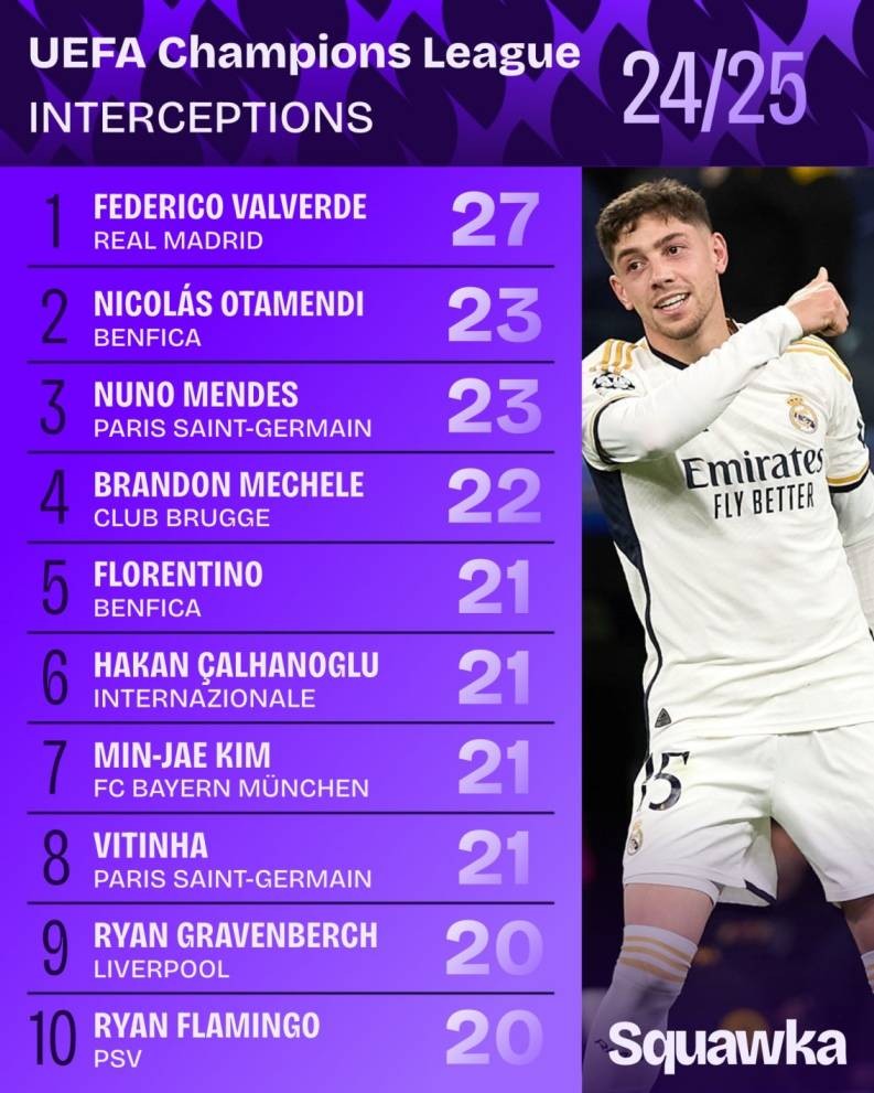 24/25赛季欧冠拦截榜:巴尔韦德27次列首位,努诺-门德斯第三