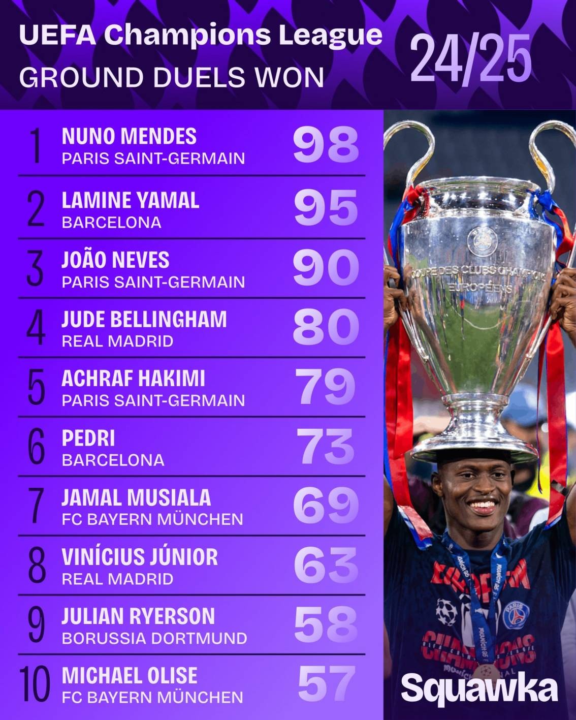 24/25赛季欧冠地面成功对抗榜:努诺-门德斯98次居首,亚马尔第二