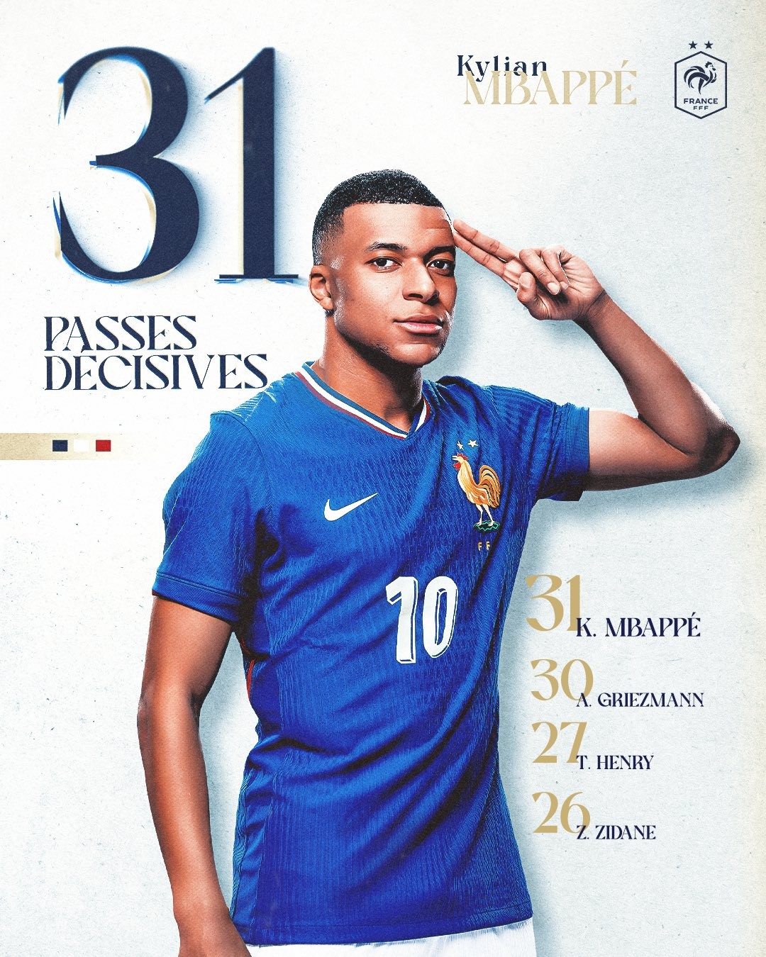 法国国家队官方发布,姆巴佩在对阵西班牙的欧国联A联赛半决赛的比赛中,送出了他国家队的第31次助攻,成为法国国家队历史上助攻最多的球员 。