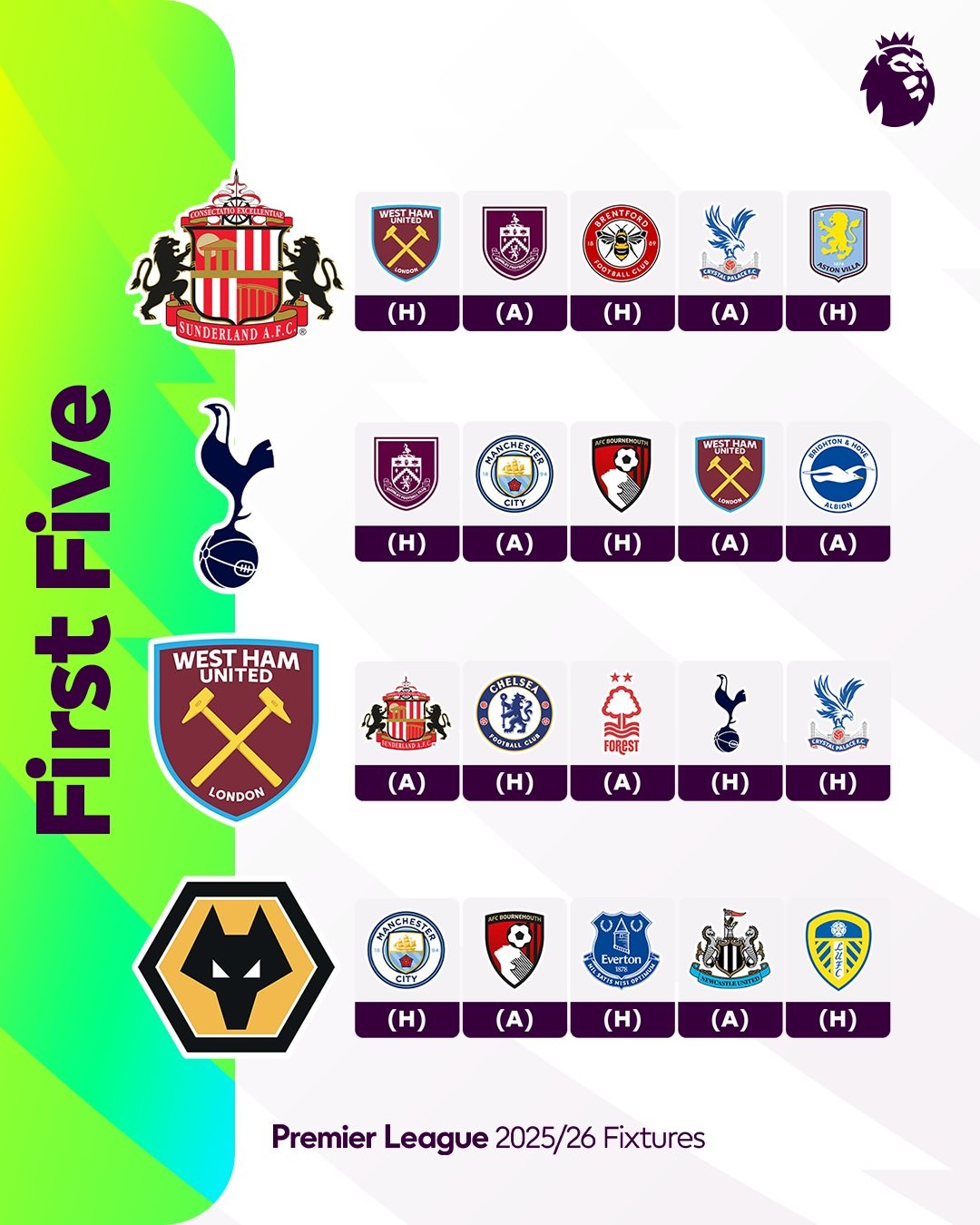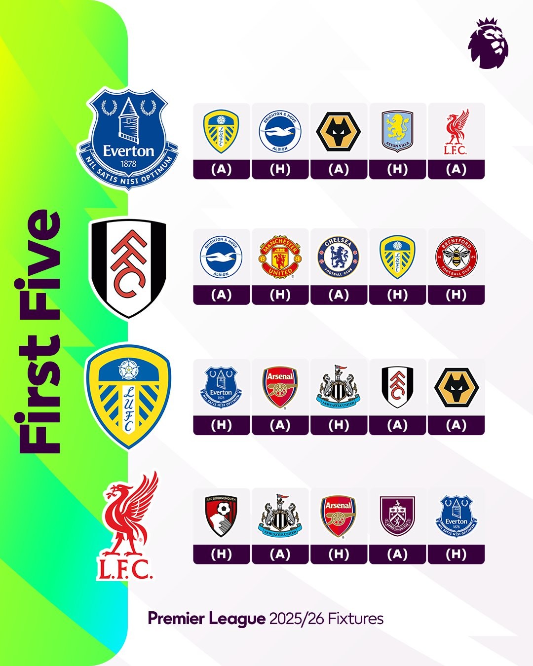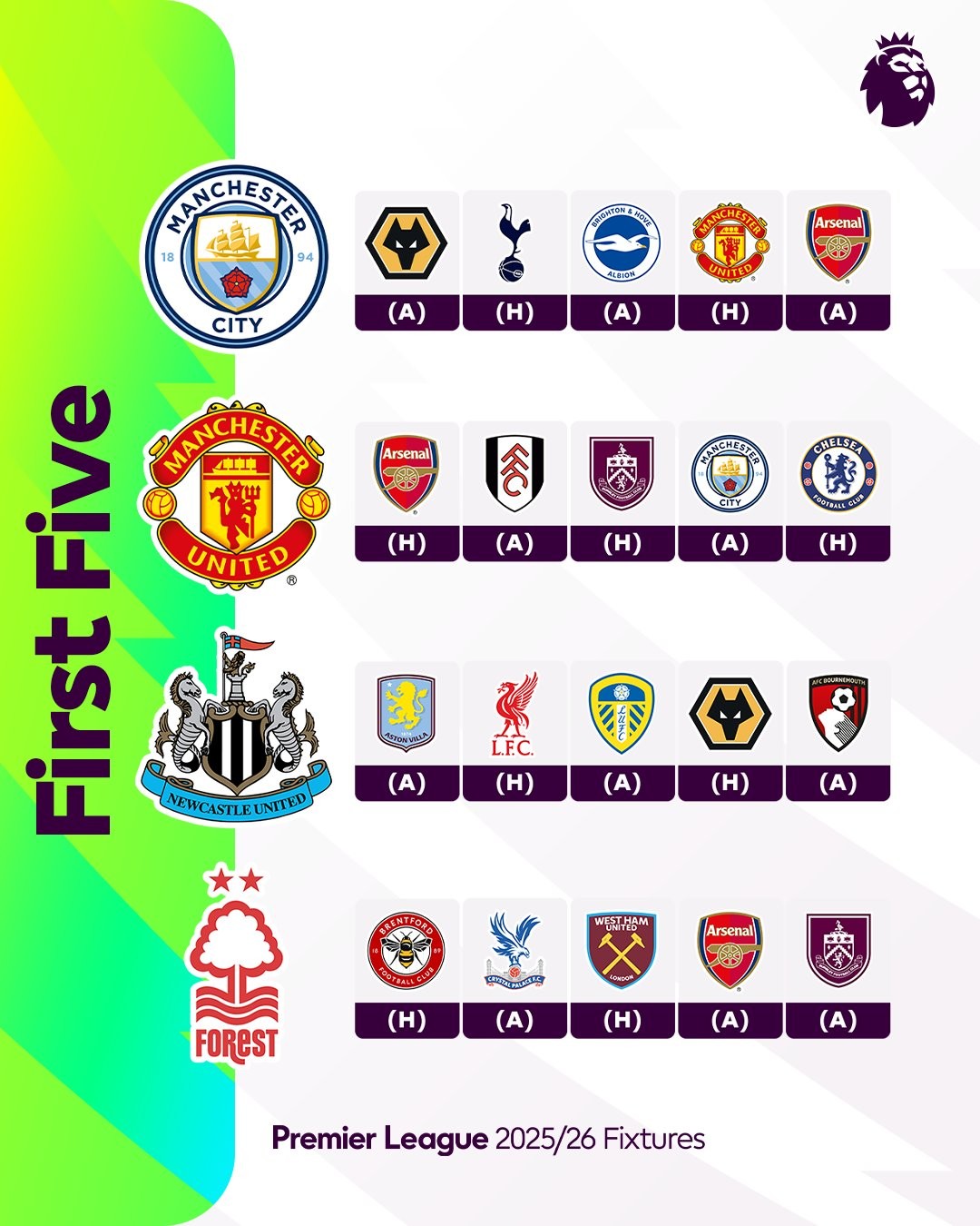 英超各队25-26赛季前5轮赛程:阿森纳、曼联迎“魔鬼”开局