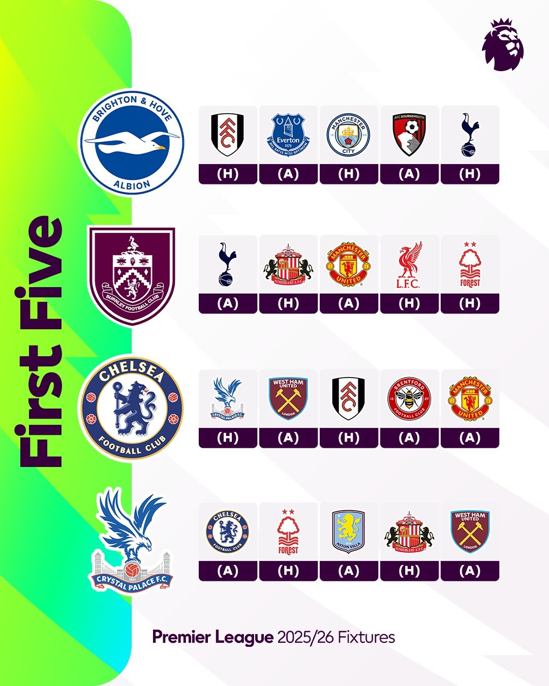 北京时间6月18日,英超官方公布2025-26赛季完整赛程,随后晒出了每支球队新赛季的前五场比赛。阿森纳、曼联等开局接连遭遇强队,维拉、水晶宫等稍显轻松,那么新赛季哪支球队的开局是“地狱”难度,哪支球队又会迎来顺风开局呢?