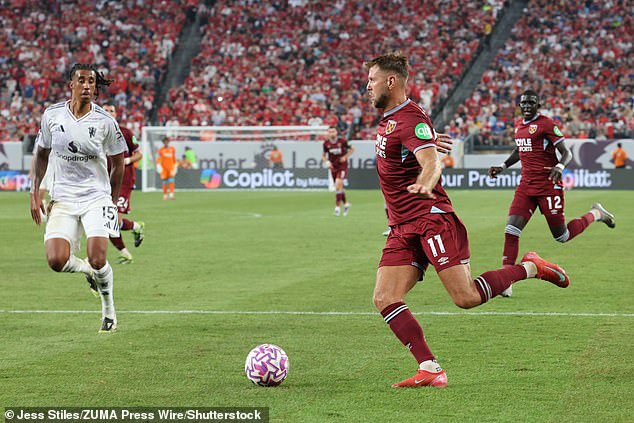 At just 20, he helps bring down the age of one of the oldest squads in the Premier League and impressed immediately when he came off the bench in West Ham’s pre-season friendly against Grasshoppers in Zurich, showing pace and desire to get down the line and whip crosses into the box much to big German Niclas Fullkrug’s enjoyment, before making his first start at wing-back in the defeat to Manchester United.