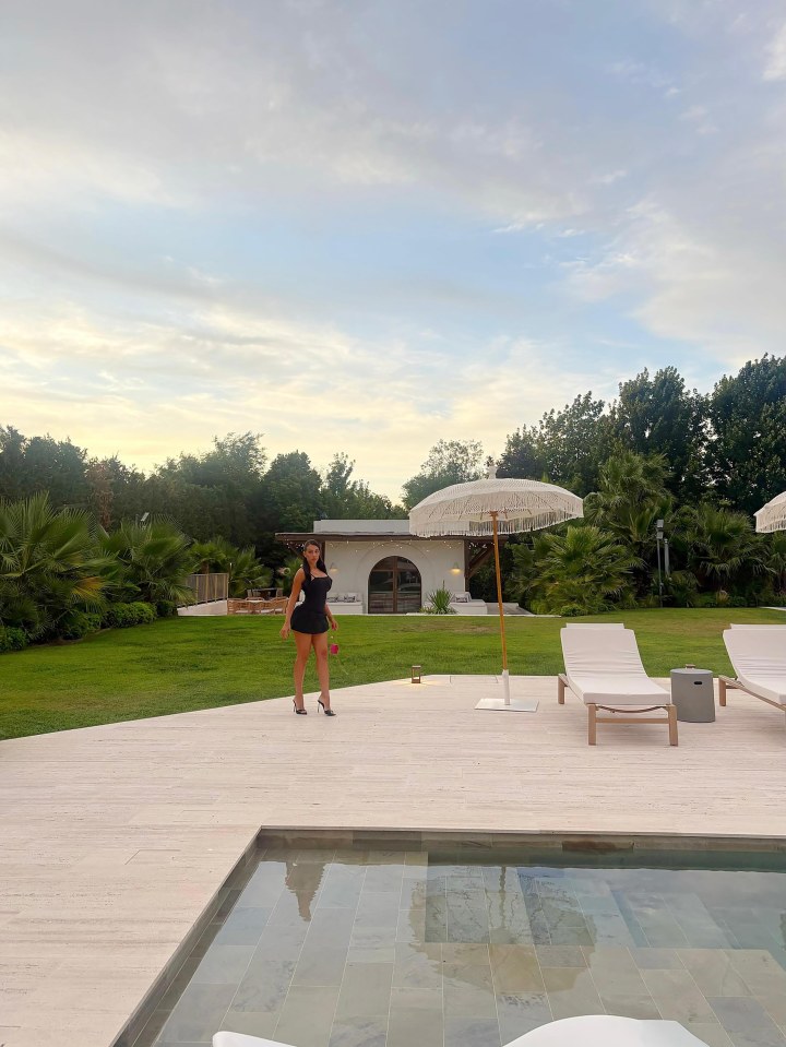 The snaps were taken in a picturesque garden by a swimming pool and one photo saw her show off her bum.