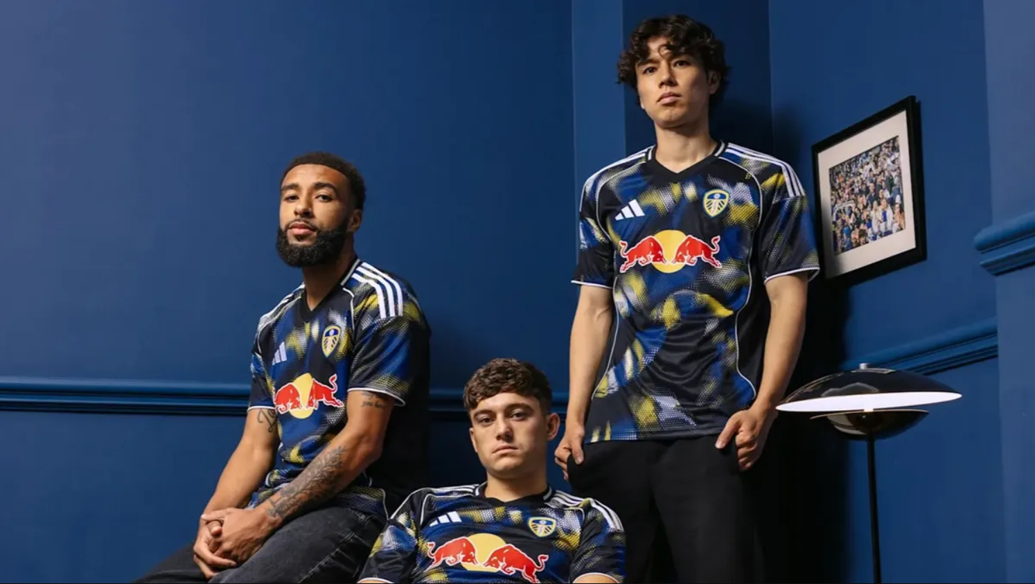 Leeds' third shirt for the new season sees a twirling white, yellow and blue scarf design on a black background, aiming to replicate the sea of scarves seen in the Elland Road stands. The design is also made up of club badge-shaped pixels.