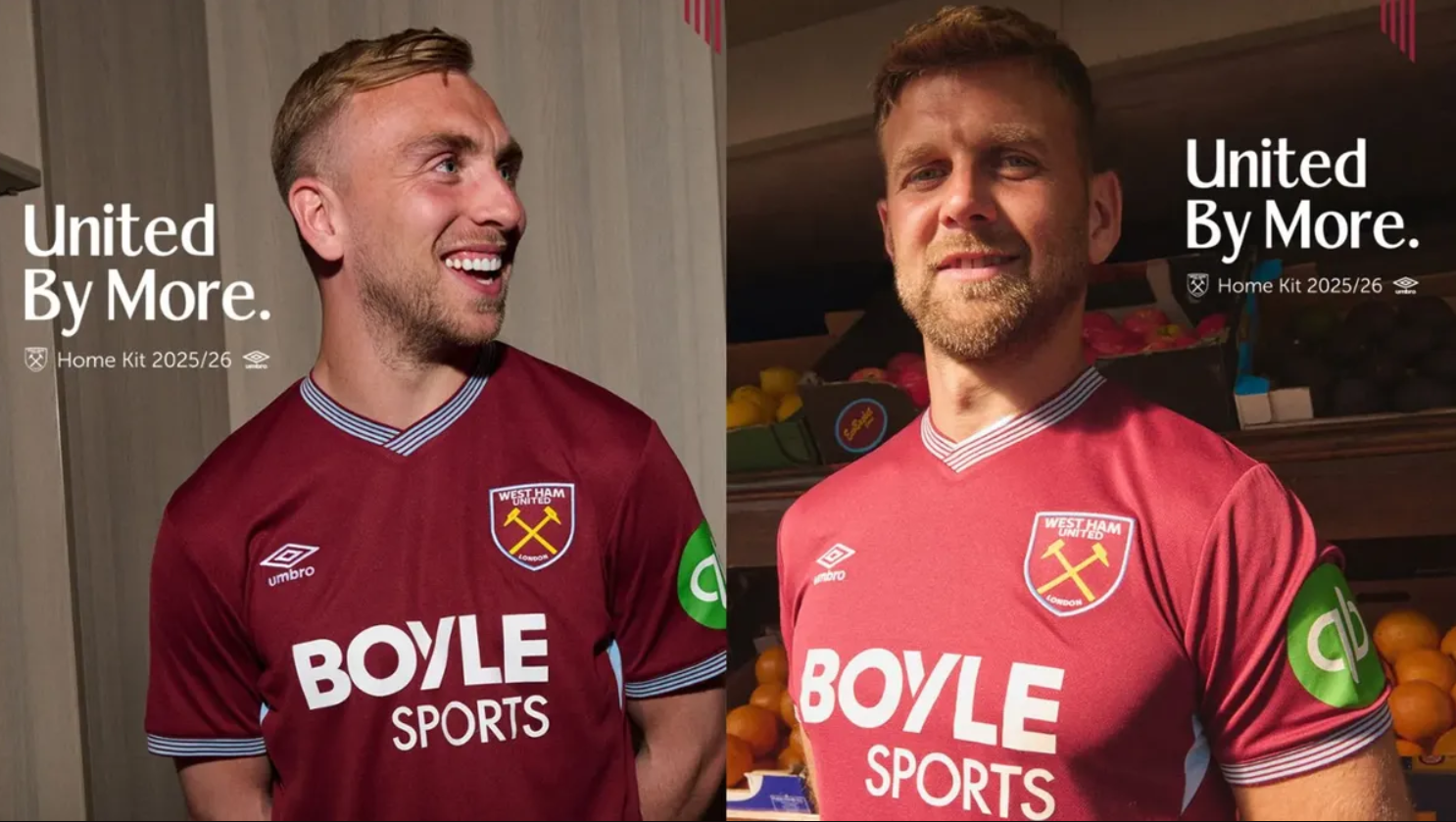 Umbro have produced the 2025/26 West Ham kit, with the shirt featuring a clean and minimal design with a claret and blue striped rib v-collar and matching cuffs.