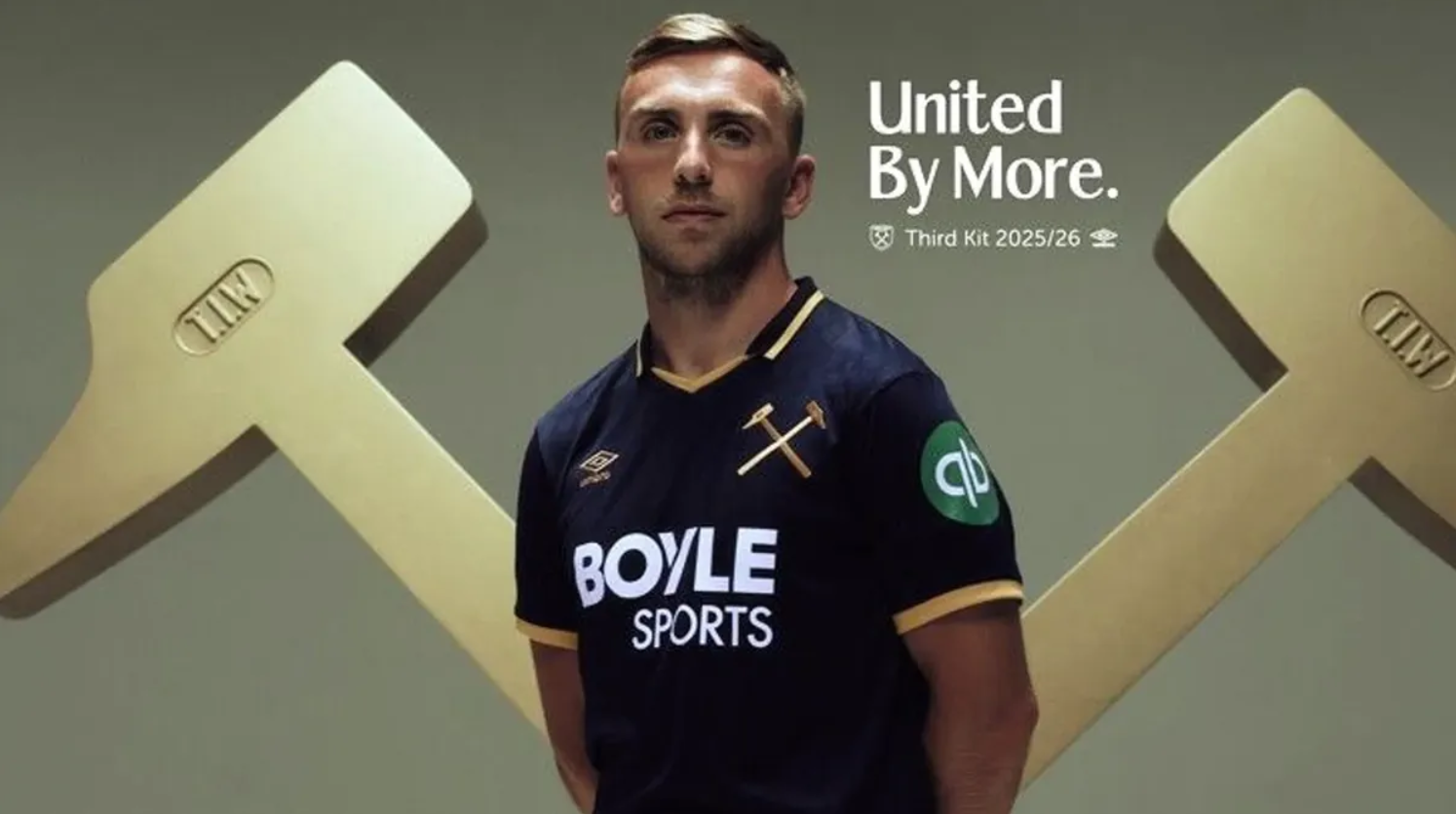 For their third kit, West Ham are going big on their crossed Hammers imagery, with a big old golden pair of the aforementioned tools taking the place of the regular club crest.