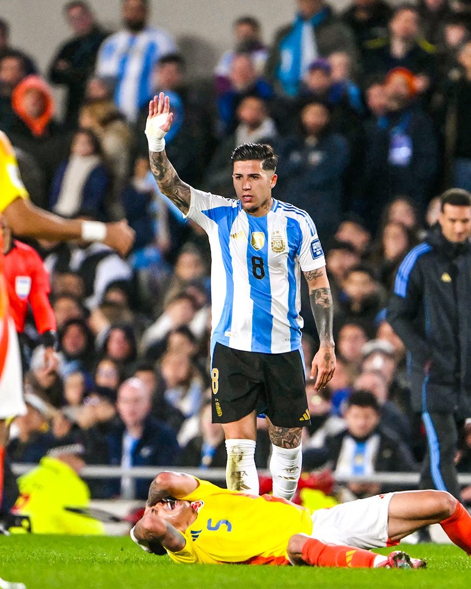 在6月份对阵哥伦比亚的世预赛中,恩佐因抬脚过高踢中对手头部而被直接红牌罚下。