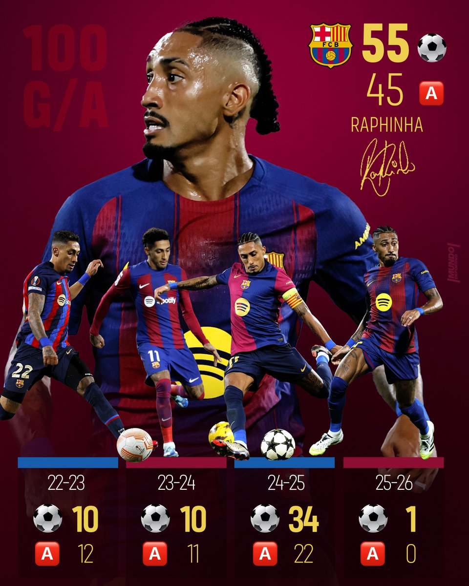 自2022年夏天从利兹联转会加盟巴萨以来,拉菲尼亚已代表巴萨在各项赛事出场145次,打入55球,送出45次助攻,直接参与了100球。