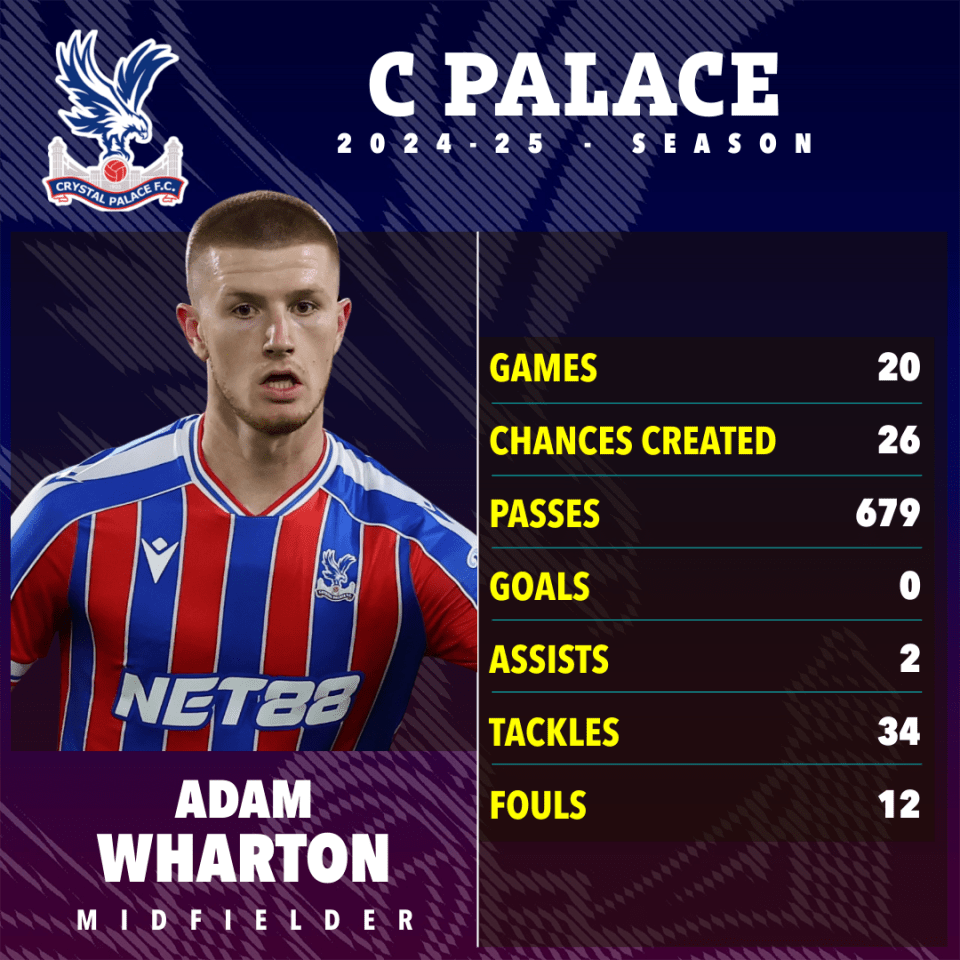 Despite missing nearly 100 days through a groin injury last season, Wharton still managed 20 Premier League appearances as Palace cracked the 50-point mark for the first time in their top-flight history