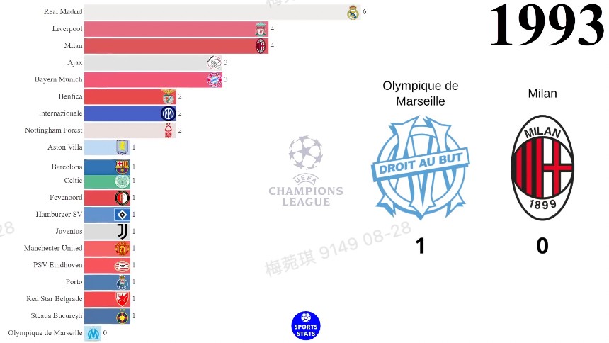 1992 - 1993 赛季欧冠改制,马赛成为首届冠军。皇马依旧强势,而巴萨、拜仁、曼联、利物浦等豪门也各有建树。