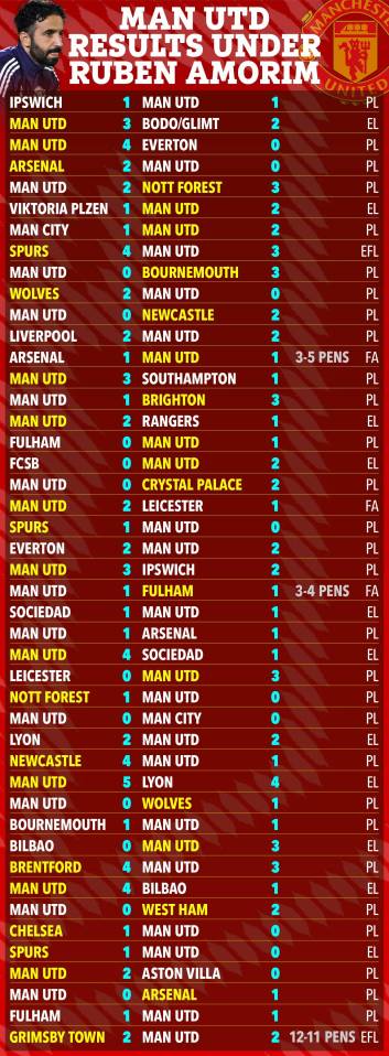 RUBEN AMORIM’S dismal Manchester United record has been laid bare after Wednesday’s humiliating defeat at Grimsby.