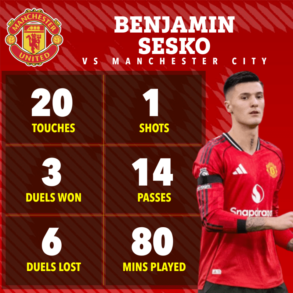 But, up front, Sesko cut an isolated figure as many of the bad memories of his much-maligned United predecessor Rasmus Hojlund echoed throughout the Etihad.