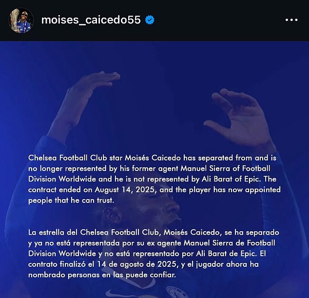 It was written on a photo of Caicedo celebrating and finished with: ‘The contract ended on August 14, 2025, and the player has now appointed people that he can trust.’