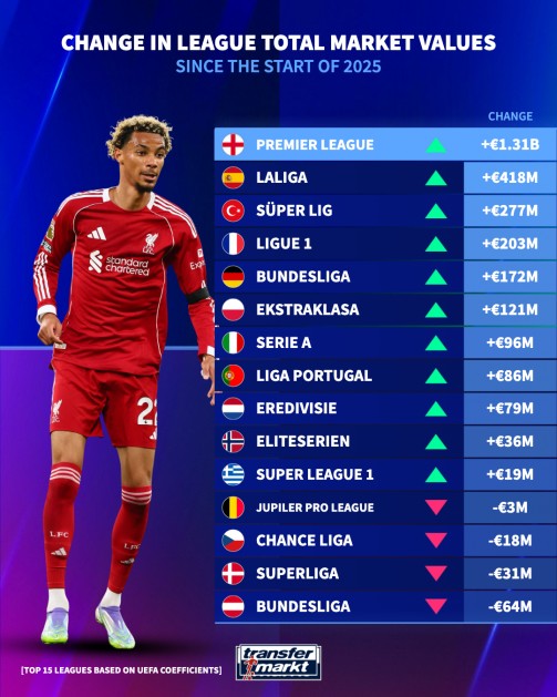2025年欧洲15大联赛身价涨跌榜:英超增加超13亿欧元第一