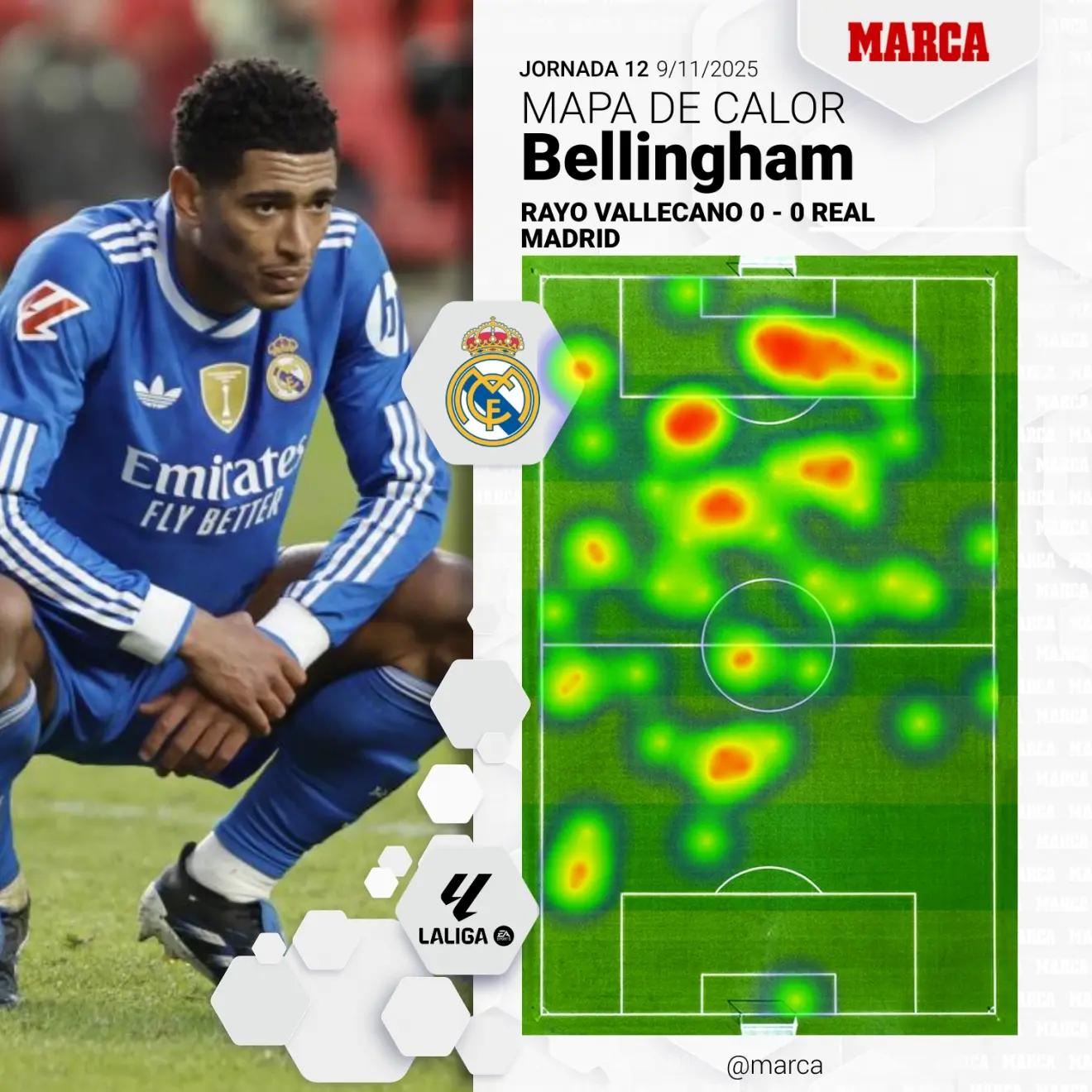 This shift coincided with other factors. Tchouaméni's injury absence and Valverde's redeployment at full-back robbed the midfield of its dominance. Meanwhile, Bellingham's advanced positioning became starkly evident in his heatmap. Against Getafe, he would drop back to the starting point of attacks; against Rayo Vallecano, however, he scarcely ventured into that area. His new role granted him greater scoring opportunities but deprived Real Madrid of his function as a link-up point. Within this vacuum, another connection suffered: the interplay between Guler and Mbappé, who in such circumstances required the team to advance through the midfield.