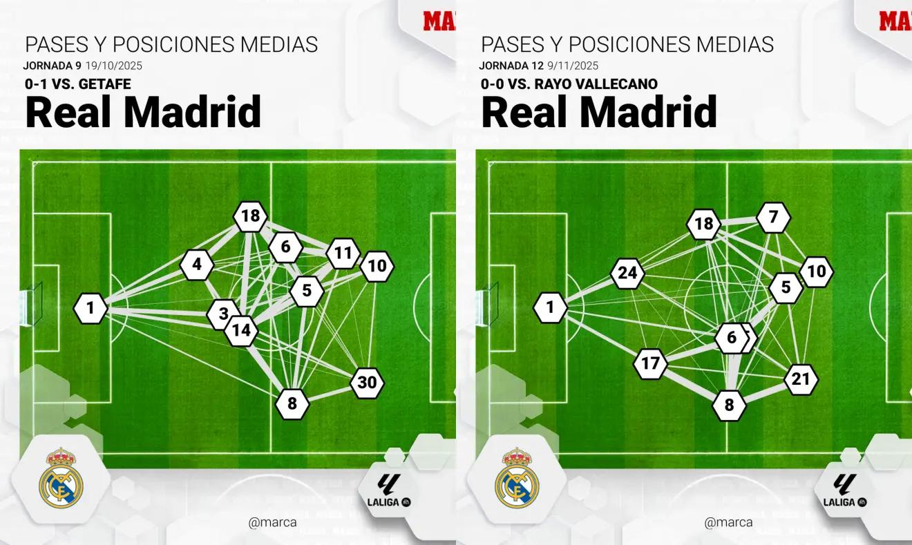 The passing map provides an X-ray view of this deeper transformation. Against Getafe, the team maintained compactness, with a clear triangular connection forming between the defensive midfielder and Bellingham, enabling cohesion through midfield. Against Rayo Vallecano, however, the shape stretched out, with Camavinga and Guillerme overlapping positions, leaving Bellingham increasingly isolated. Passing lanes shifted to the flanks. With progress through the centre stifled, the full-backs – Valverde and Carreras – became the new initiators. Midfield cohesion gradually dissipated into a wider yet more fragile network.
