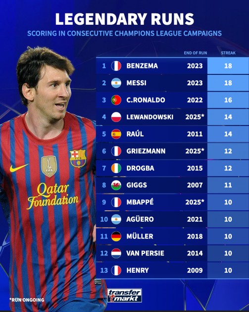 北京时间11月27日,德转统计出了欧冠历史连续最长赛季进球的10位球员,本泽马和梅西同以连续18个赛季欧冠进球排名第一,C罗连续16个赛季进球排名第三。
