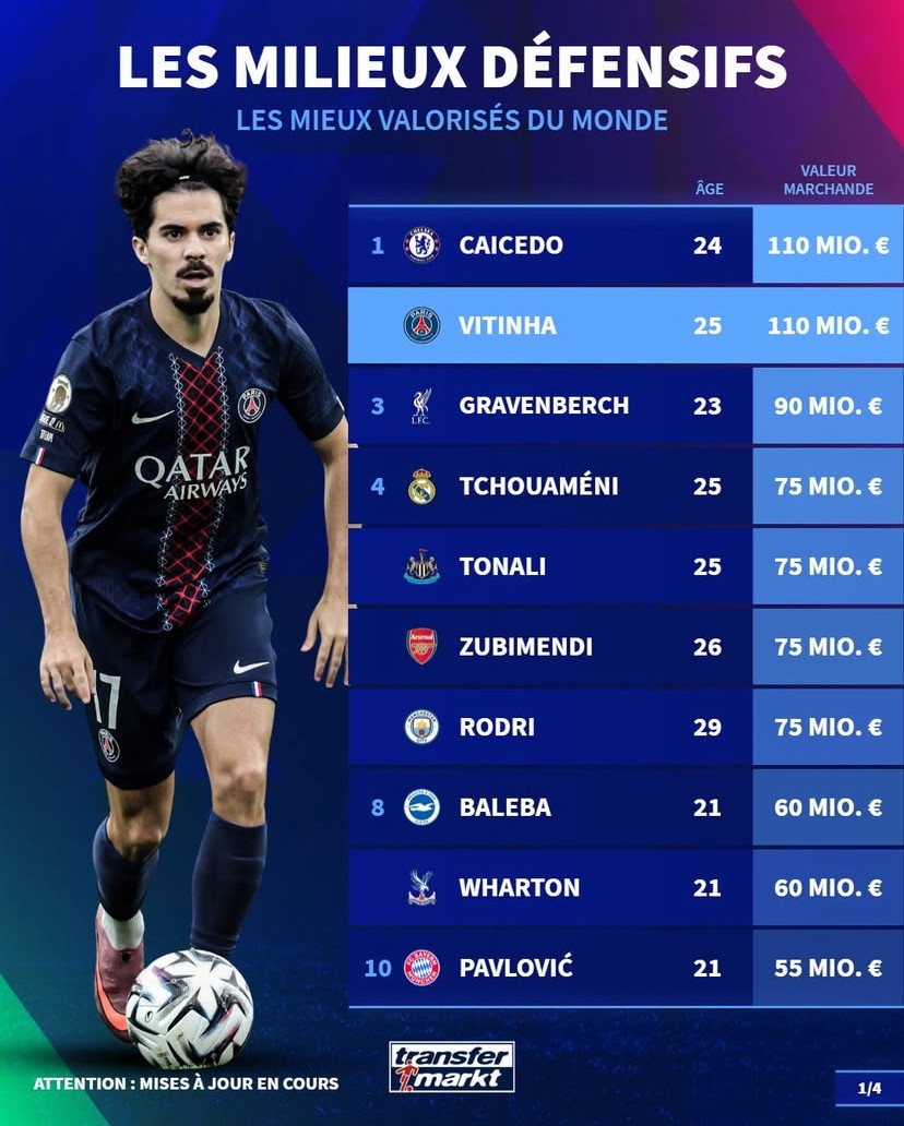 1. 维蒂尼亚(巴黎圣日耳曼) 25岁 1.1亿欧元