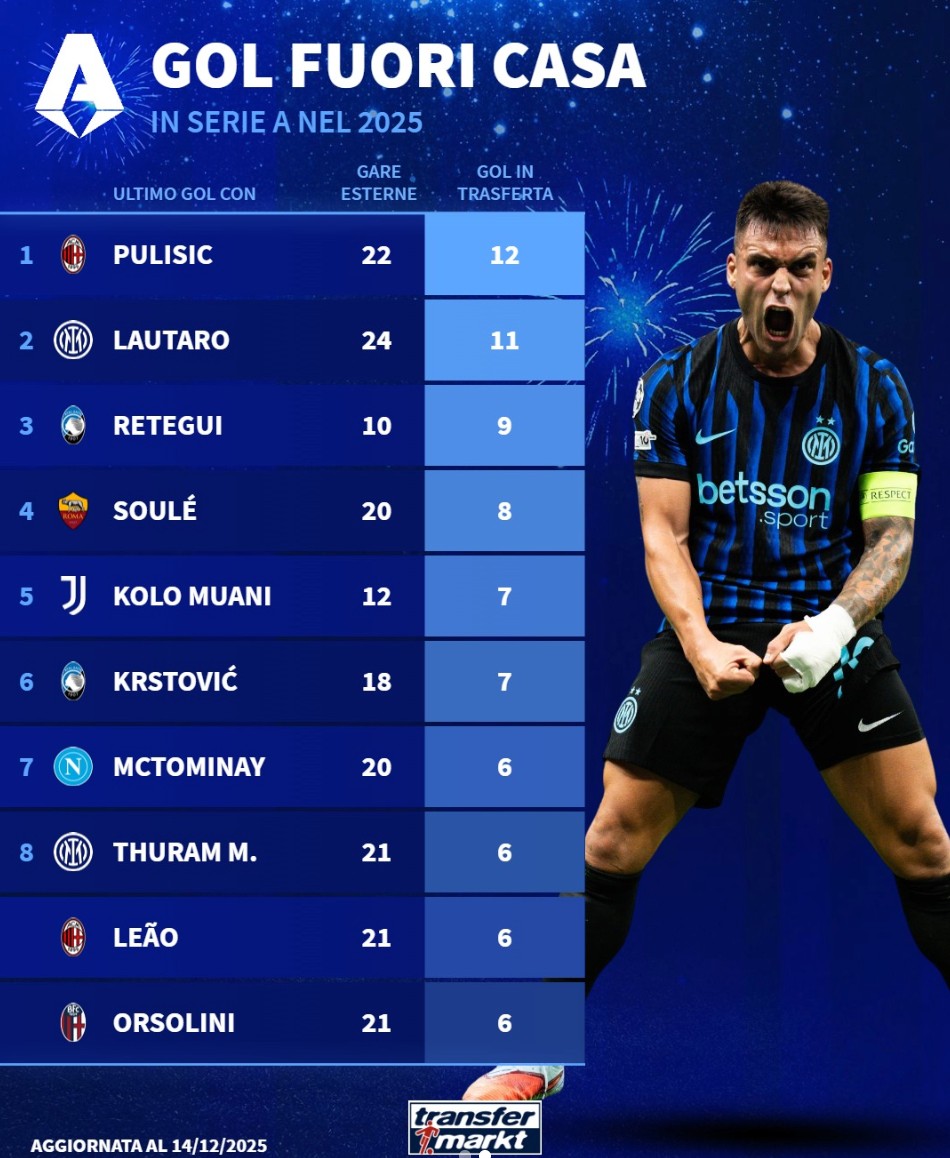 北京时间12月15日,德转列出了意甲2025年各项赛事客场比赛进球最多的10名球员,普利希奇22战打进12球排名第一,劳塔罗24战11球第二,已经离开意甲的雷特吉和科洛-穆阿尼上榜。