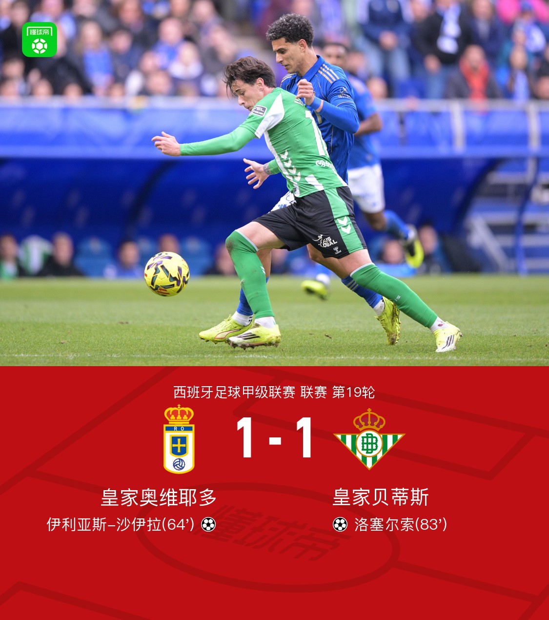 奥维耶多1-1贝蒂斯,沙伊拉贴地斩,安东尼助攻洛塞尔索扳平