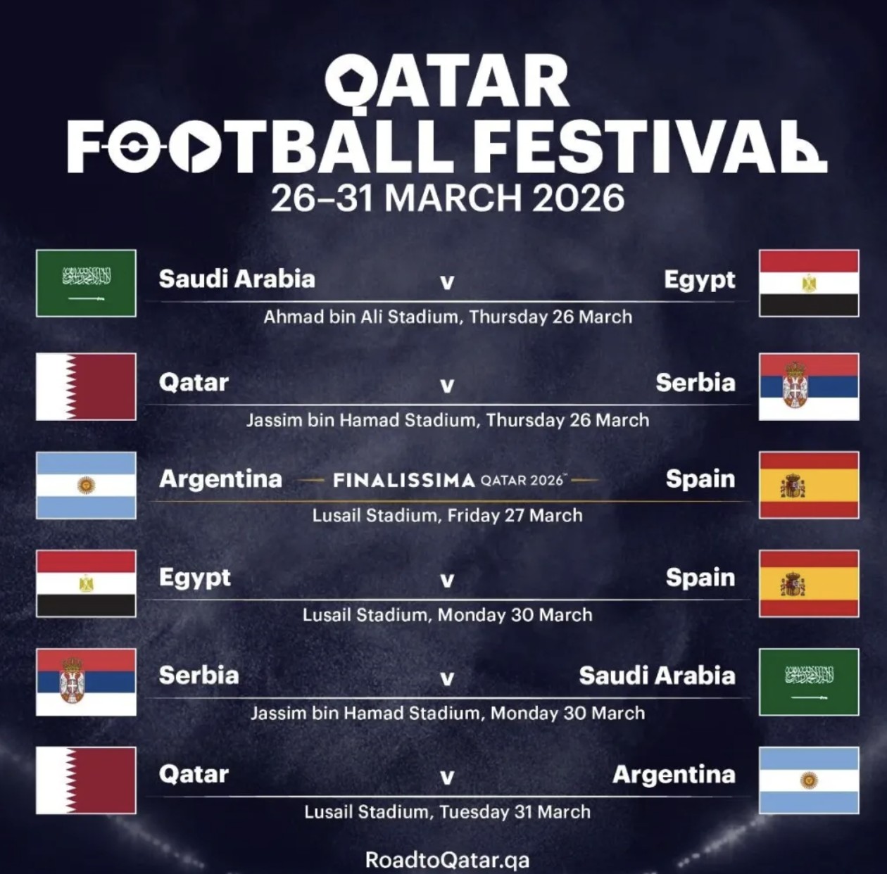 与此同时,2026年卡塔尔足球节将于3月26日至31日举行。期间,卡塔尔将举办多场高水平国家队赛事,其中就包括2026年欧美超级杯。
