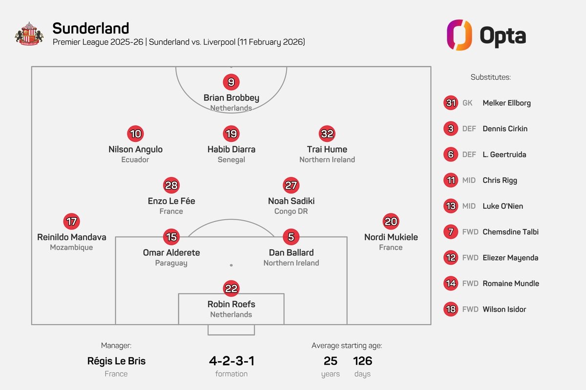 桑德兰首发:22-罗埃夫斯、20-穆杰莱、5-巴拉德、15-阿尔德雷特、17-雷尼尔多、32-休姆、27-萨迪基、28-勒费埃、10-尼尔松-安古洛、19-哈比卜-迪亚拉、9-布罗贝伊