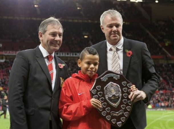 帖子里有一张照片:一个穿着亮红色外套的11岁男孩,在老特拉福德球场的草坪上,从俱乐部传奇布莱恩-罗布森和加里-帕里斯特手中接过冠军奖杯。那场颁奖是在曼联对阵水晶宫的英超比赛之前进行的。