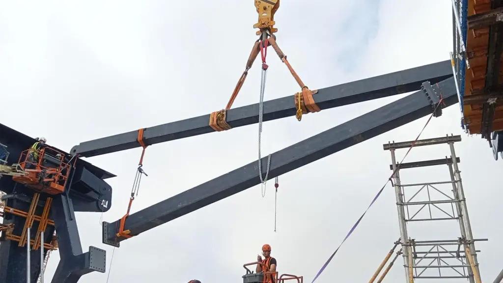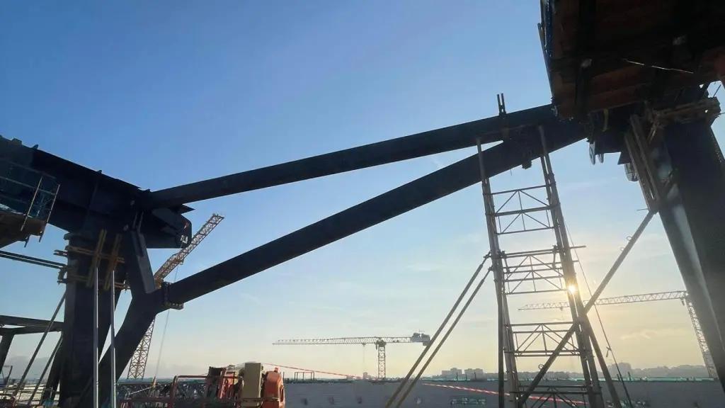 正如《Culemanía》此前披露,德国公司Montage Service将负责顶棚钢缆的安装和张拉、特殊膜结构屋顶的铺设、太阳能板安装以及照明系统的组装。虽然距离顶棚安装仍有大约一年时间,但利马克公司已经在为后续工程做准备。工人正在安装共46根支撑立柱,这些立柱将支撑球场顶棚的主体结构。每根梁重约28吨,高约五米,通过大型起重机吊装至第十层结构位置,这一层将构成未来球场顶棚。