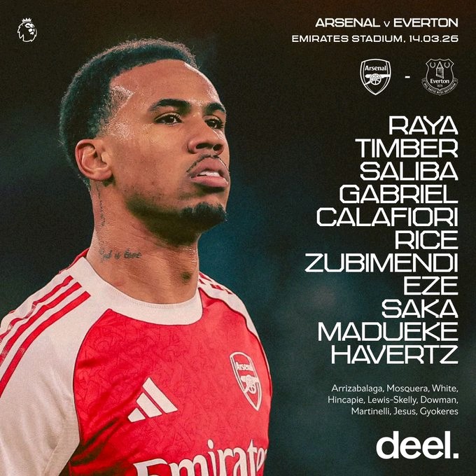 阿森纳vs埃弗顿:哈弗茨、萨卡首发,卡拉菲奥里、埃泽出战
