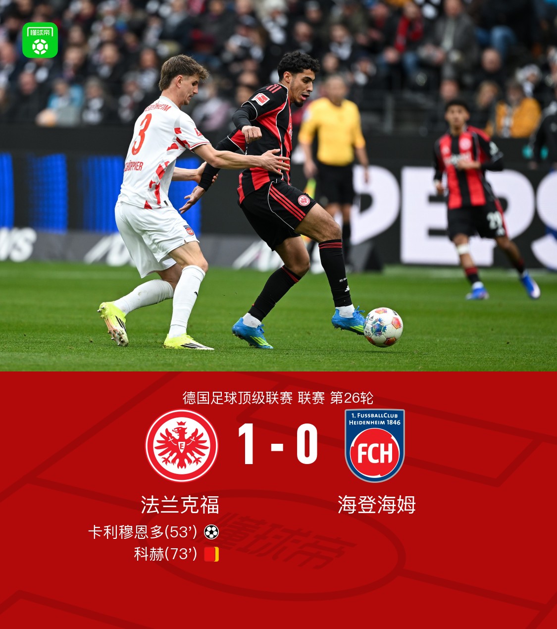 法兰克福1-0海登海姆,卡利穆恩多破门,科赫染红
