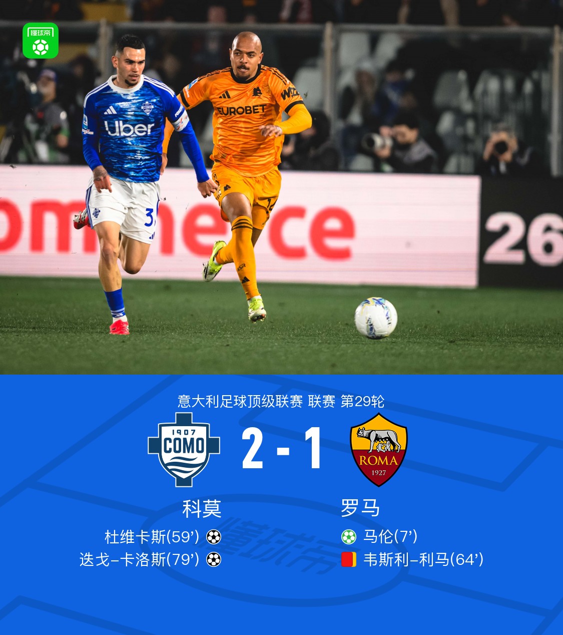 北京时间3月16日意大利足球顶级联赛第29轮,科莫主场对阵罗马。比赛中罗马率先凭借马伦的点球取得进球,随后科莫通过配合由杜维卡斯打入一球扳平比分,之后韦斯利-利马因累计黄牌被罚下,科莫抓住机会由迭戈-卡洛斯再入一球。最终比分科莫2-1罗马。