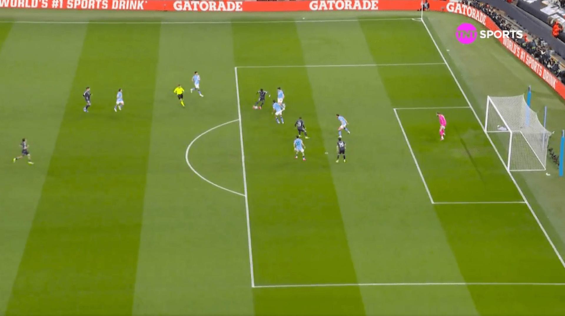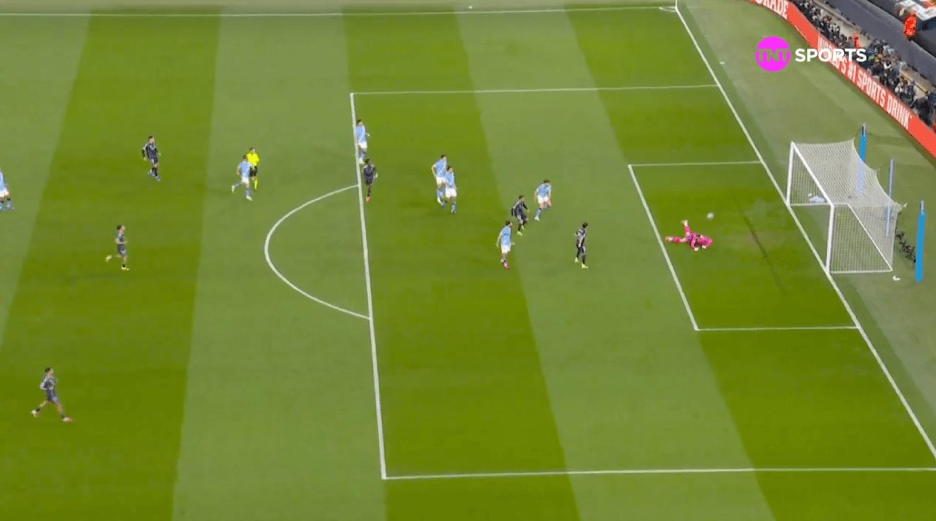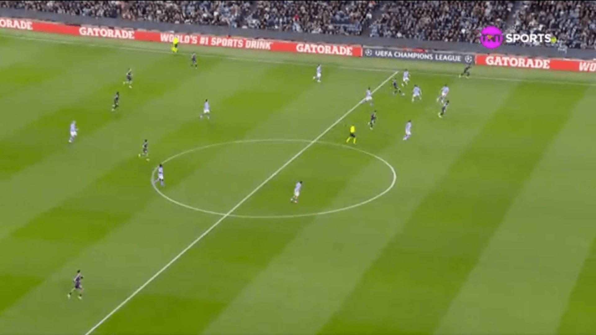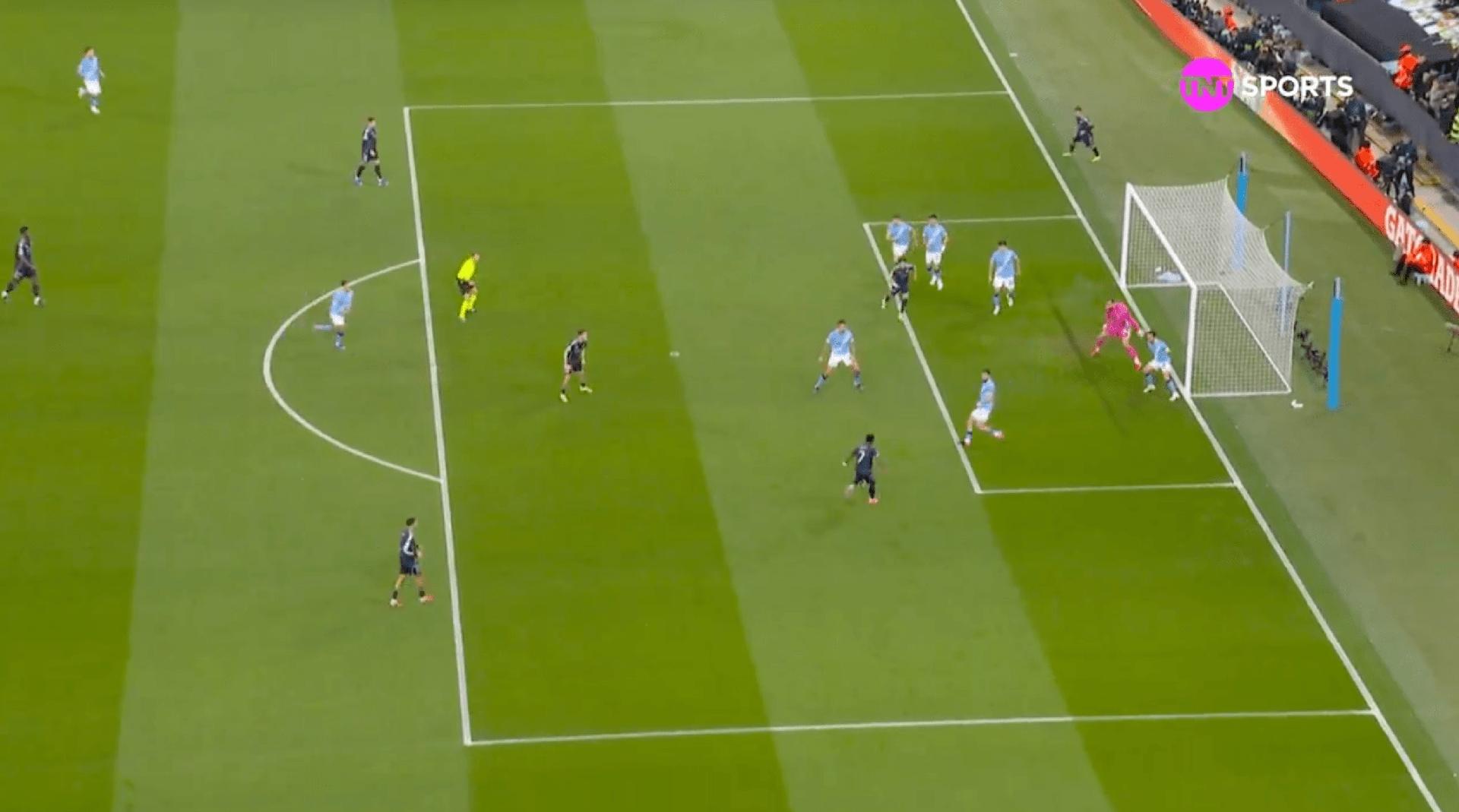 第17分钟,巴尔韦德为这次进攻注入了速度,他带球越过中线,随后送出一记穿透曼城防线的传球,让维尼修斯前插。