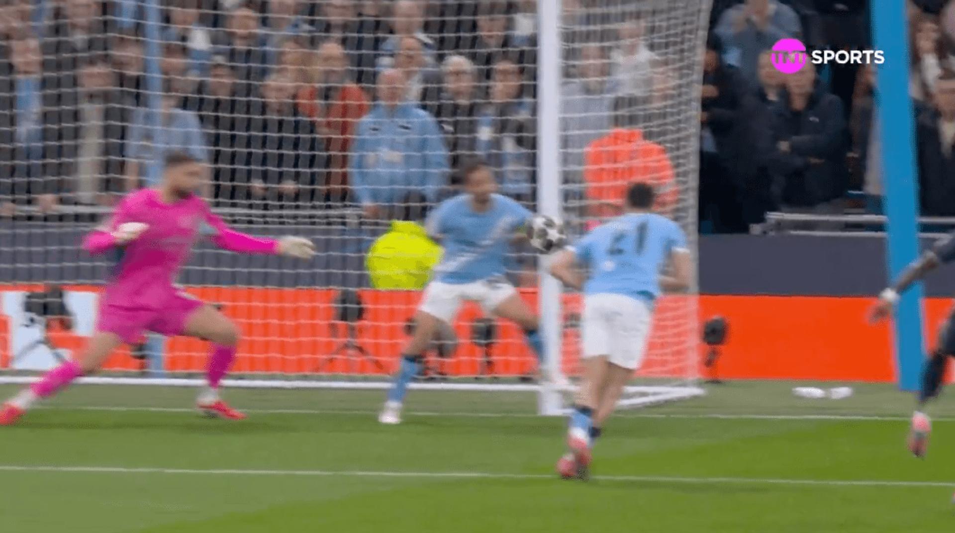 助理裁判举旗示意越位,但当时不清楚判的是维尼修斯(从巴尔韦德传球时看,他似乎并未越位)还是卜拉欣——巴尔韦德最初传球时,他处在曼城防线身后。