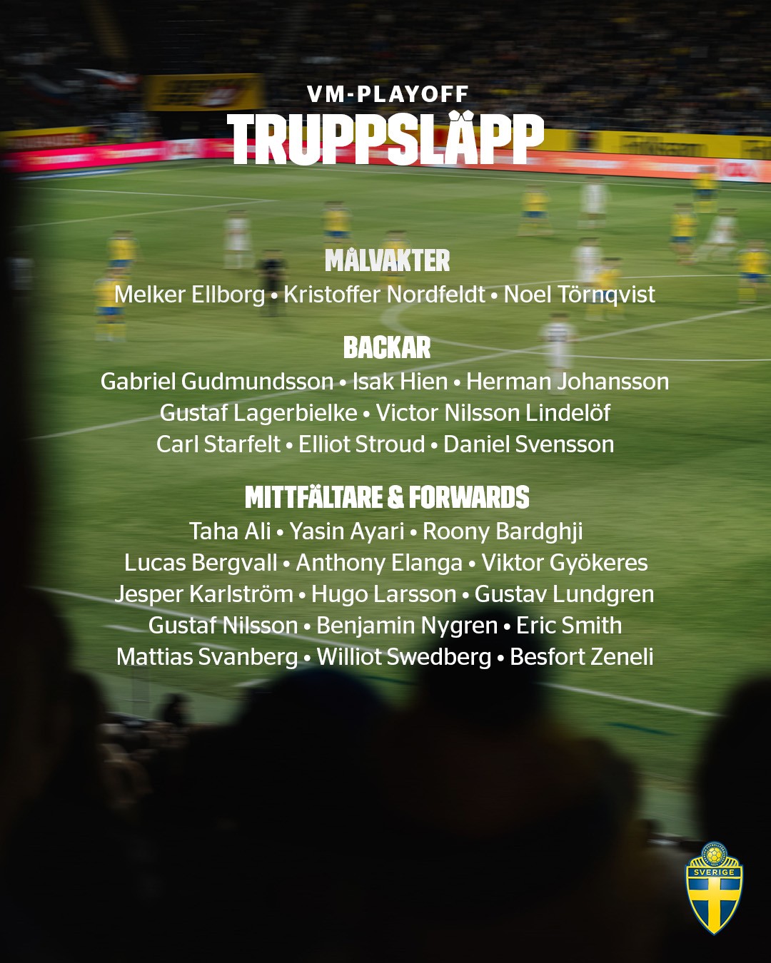 中前场:塔哈-阿里(马尔默)、阿亚里(布莱顿)、巴尔德吉(巴塞罗那)、贝里瓦尔(托特纳姆热刺)、埃兰加(纽卡斯尔联)、哲凯赖什(阿森纳)、卡尔斯特伦(乌迪内斯)、胡戈-拉松(法兰克福)、隆格伦(加尔斯)、尼尔松(布鲁日)、尼格伦(凯尔特人)、史密斯(圣保利)、斯万贝里(沃尔夫斯堡)、斯韦德贝里(塞尔塔)、泽内利(圣吉罗斯)