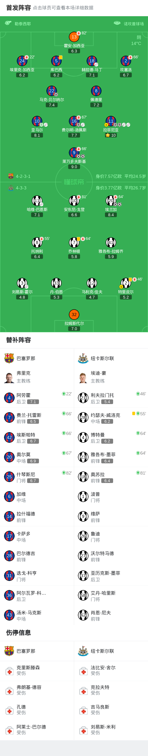 北京时间3月19日欧洲冠军联赛 1/8决赛次回合,巴塞罗那对阵纽卡斯尔联。巴塞罗那拉菲尼亚梅开二度,马克-贝尔纳尔破门,费尔明-洛佩斯破门,莱万多夫斯基梅开二度,亚马尔破门。纽卡斯尔联埃兰加梅开二度。最终比分巴萨 7-2 纽卡斯尔联。两回合总比分巴萨8-3纽卡斯尔联。
