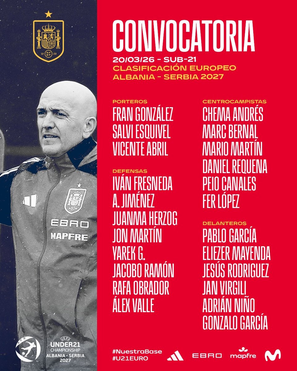 北京时间3月20日,西班牙U21国青队公布了新一期大名单,巴塞罗那中场马克-贝尔纳尔和皇家马德里前锋贡萨洛-加西亚入选。