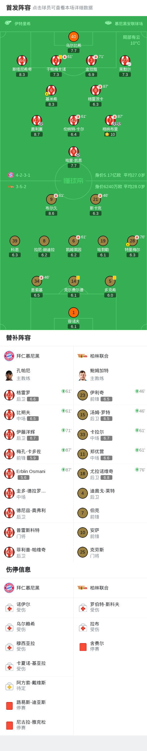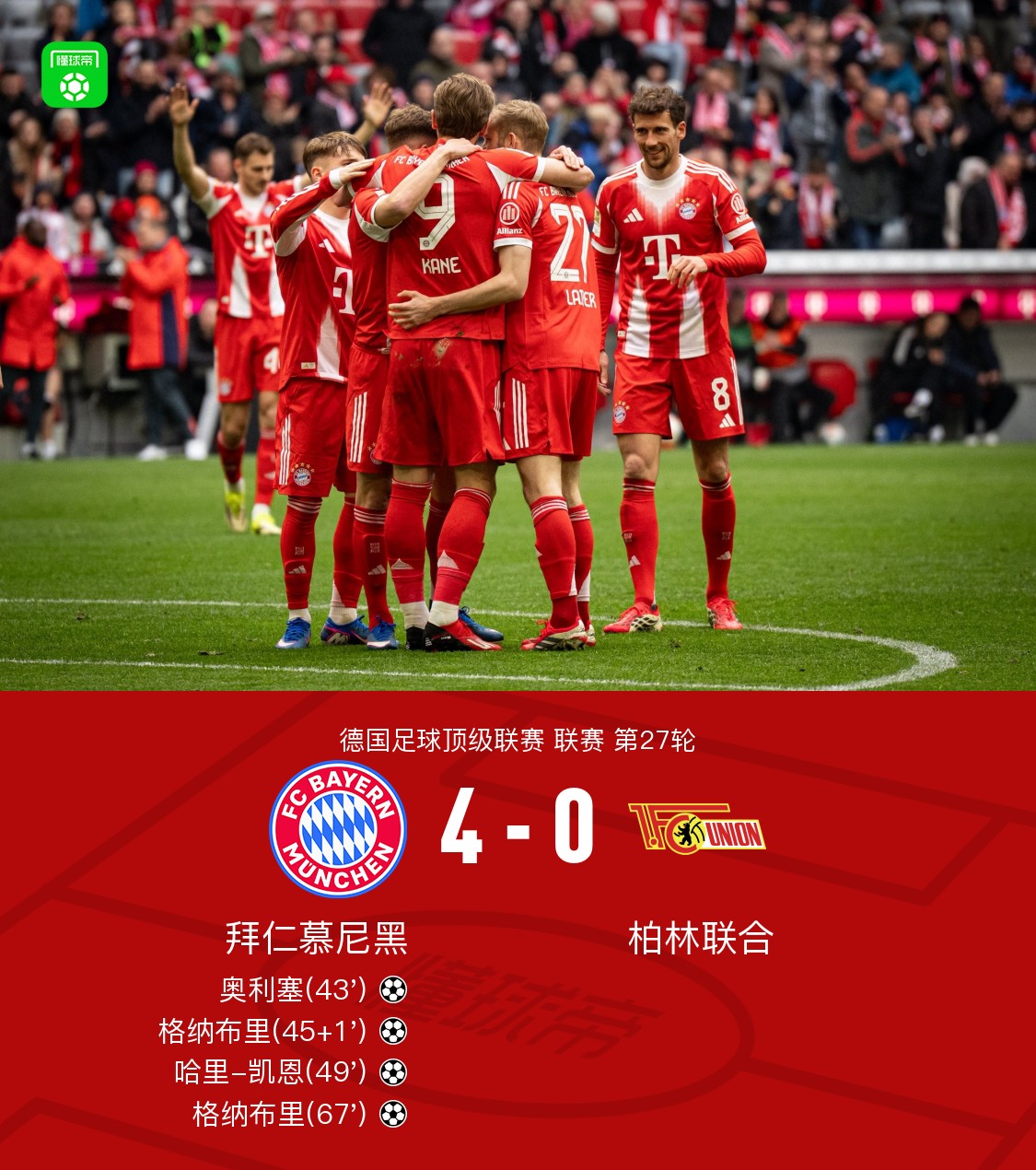 北京时间3月21日德甲联赛第27轮,拜仁慕尼黑主场对阵柏林联合。上半场,奥利塞停球内切精彩破门,格纳布里扩大领先,卡尔射中立柱,格雷茨卡错失空门;下半场,凯恩再次扩大领先,格纳布里完成梅开二度,奥利塞低射中柱。最终,拜仁主场4-0大胜柏林联。