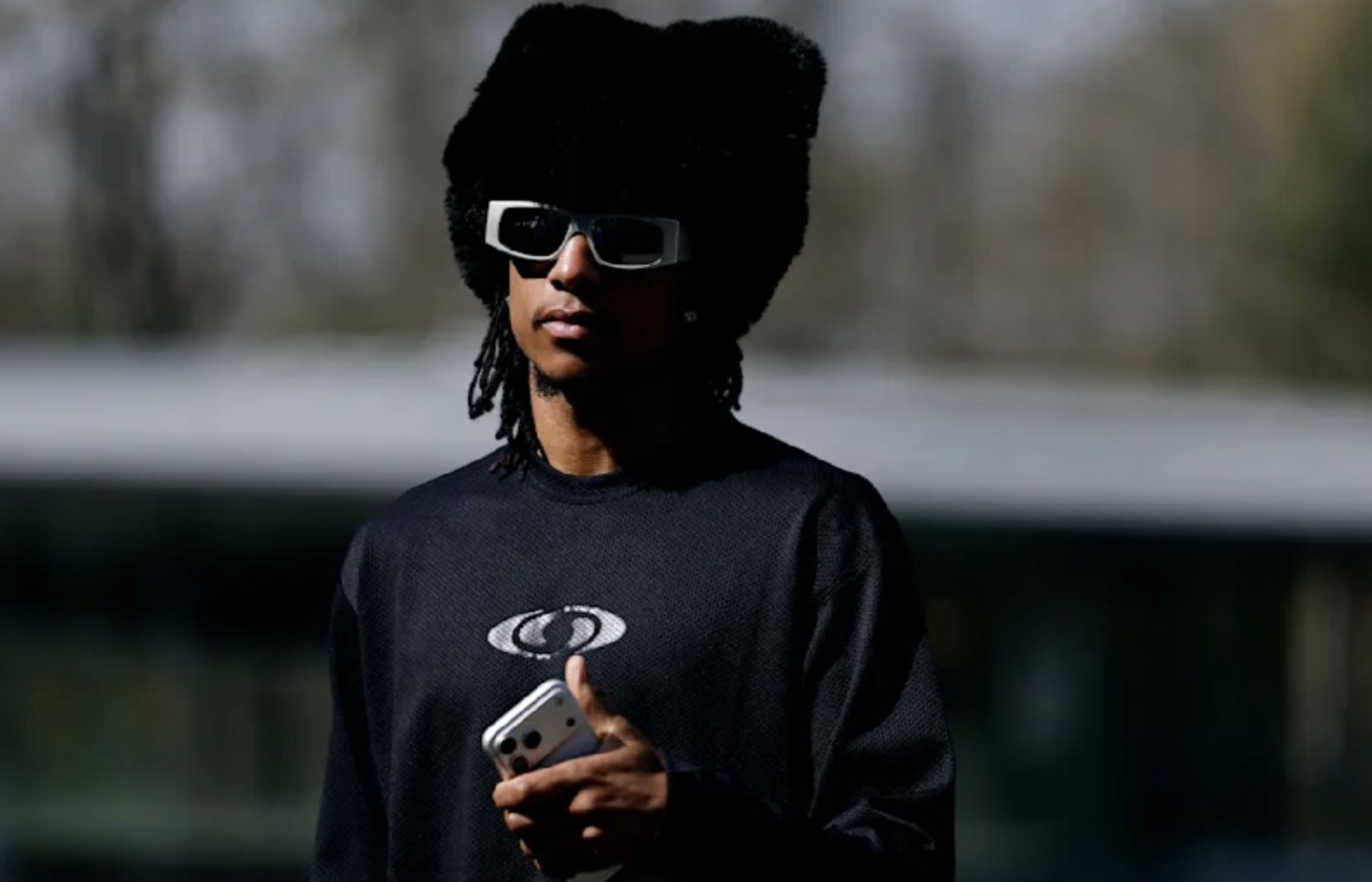 这位边锋佩戴了一顶引人注目的黑色毛皮帽,帽子顶部有两只类似米老鼠的黑色耳朵,让人联想到这一知名的卡通形象。在帽子之外,奥利塞搭配了银白色的太阳镜,身穿黑色复古毛衣和黑色喇叭裤,脚踩白色运动鞋。