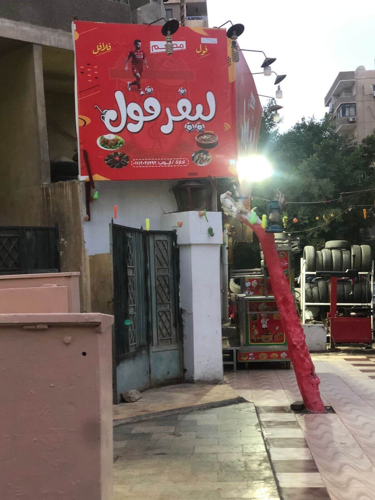 最能说明这一切的,是开罗纳赛尔城一家售卖蚕豆泥和炸鹰嘴豆饼的小食店。这家店用阿拉伯语取名为“Liverfool”,巧妙融合了利物浦队名与自家菜品,店招最上方便是萨拉赫的照片。