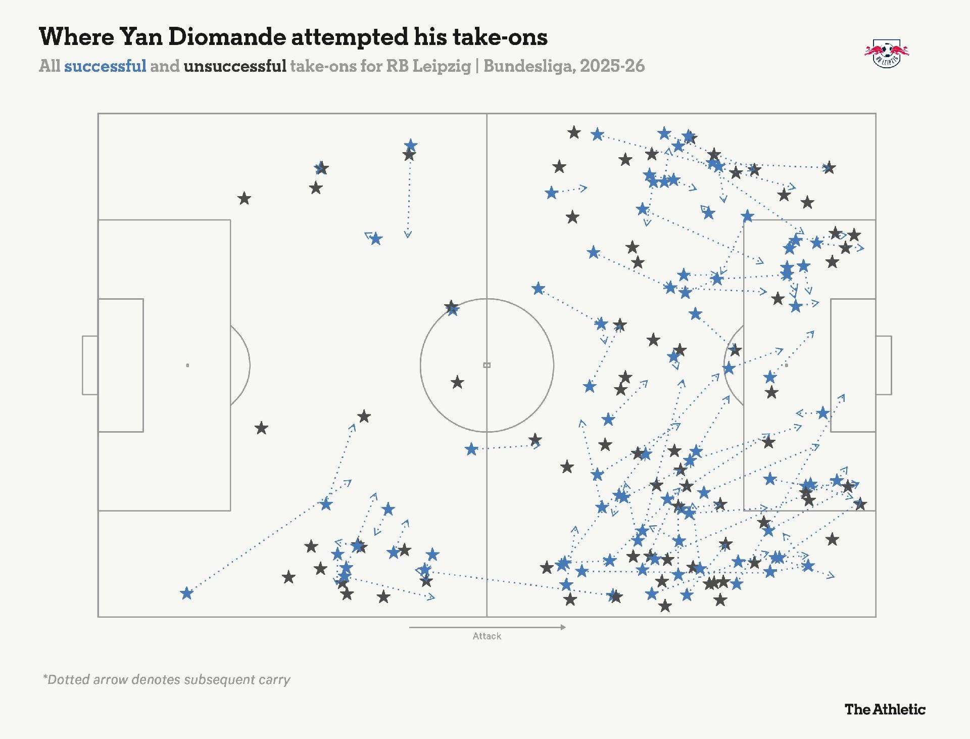 这位科特迪瓦国脚去年夏天才从莱加内斯转会至RB莱比锡,但已引起广泛关注。如上图所示,迪奥曼德非常喜欢盘带……非常频繁。在欧洲顶级联赛所有球员中,只有维克托-穆尼奥斯(奥萨苏纳)、维尼修斯(皇家马德里)和亚马尔(巴塞罗那)的过人次数比他更多——如下图所示,他能在两条边路都完成突破。