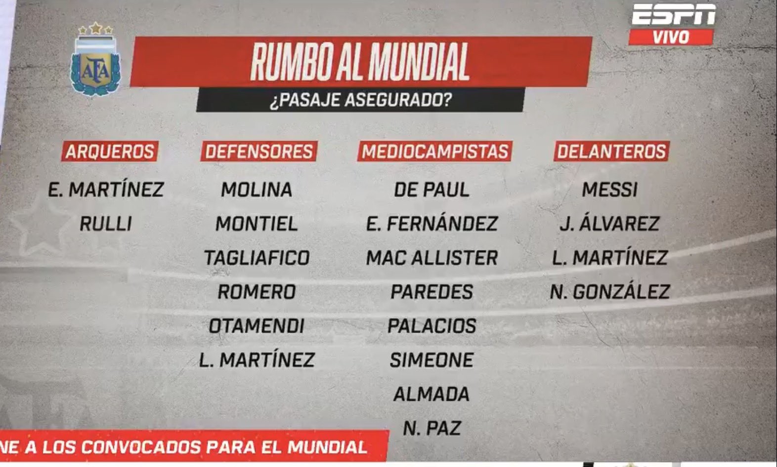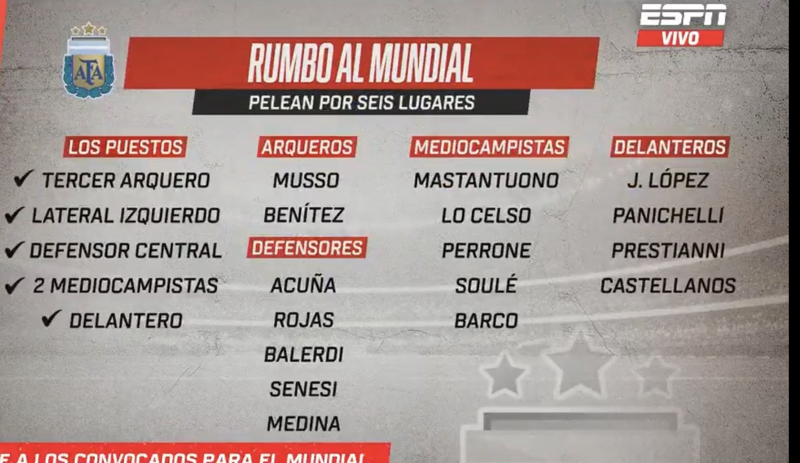 根据阿根廷ESPN的最新报道,阿根廷队世界杯名单已经确定了20个人,剩余6个名额将由16个人竞争。