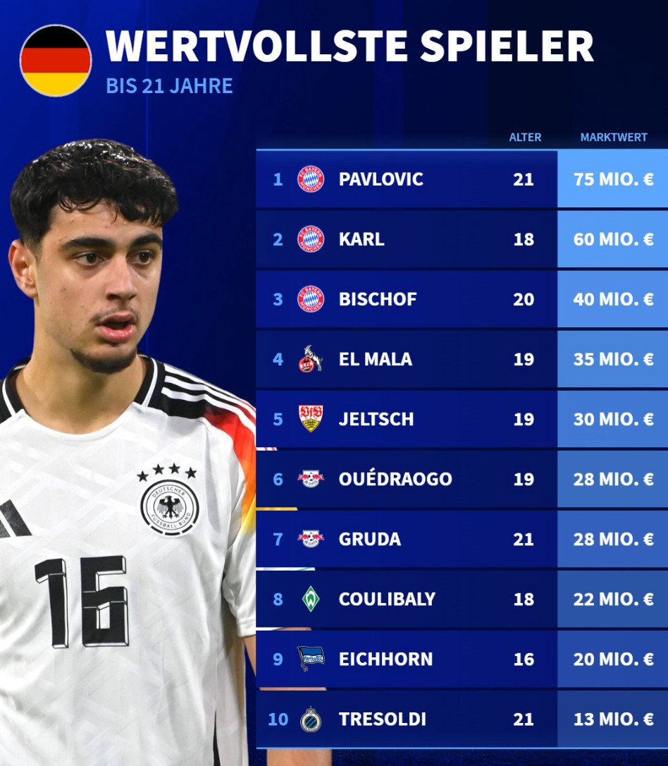 北京时间3月29日,在完成了欧洲五大联赛球员的身价更新之后,德转列出了德国U21球员身价前10,拜仁慕尼黑占据前3位,亚历山大-帕夫洛维奇7500万欧元第1,伦纳特-卡尔6000万欧元第2,比朔夫4000万欧元第3。
