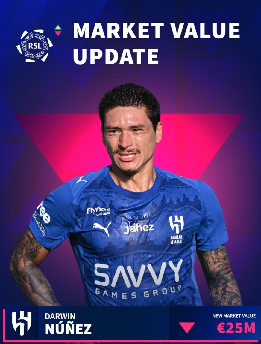 德国转会市场更新了沙特联赛的球员身价,其中降幅最大的是利雅得新月前锋努涅斯,目前他的身价为2500万欧元,较上期下降1000万欧元。