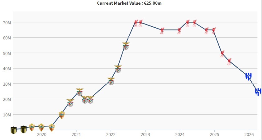努涅斯身价跌1000万至2500万欧,两年前巅峰身价7000万欧