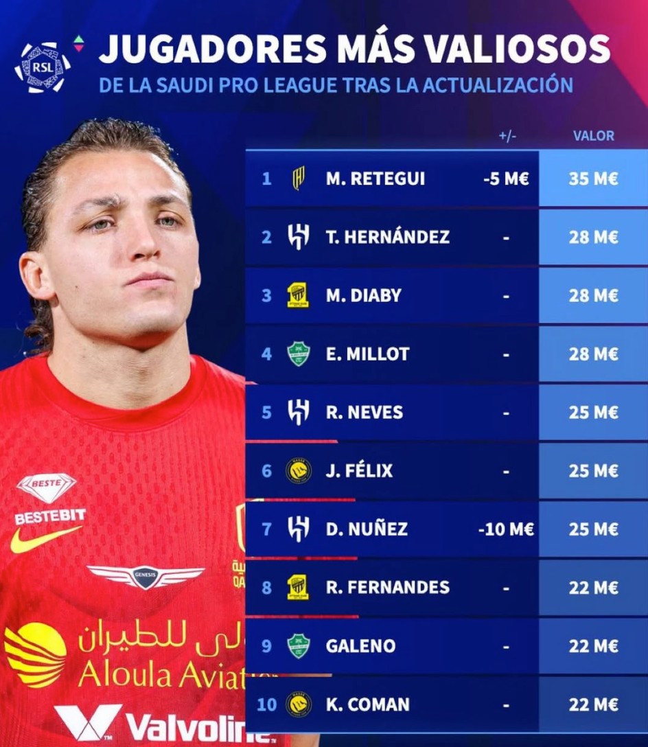 沙特联赛球员身价榜:雷特吉3500万第1,菲利克斯、努涅斯在列
