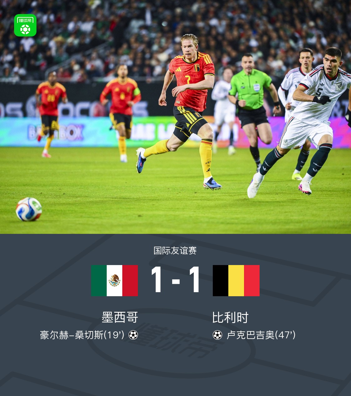 北京时间4月1日国际友谊赛,墨西哥对阵比利时。墨西哥豪尔赫-桑切斯破门。比利时卢克巴吉奥破门。最终比分墨西哥 1-1 比利时。