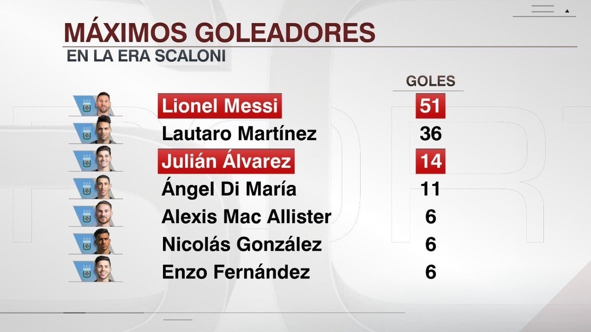 Argentina's top scorers under Scaloni: Messi leads with 51 goals, Alvarez third