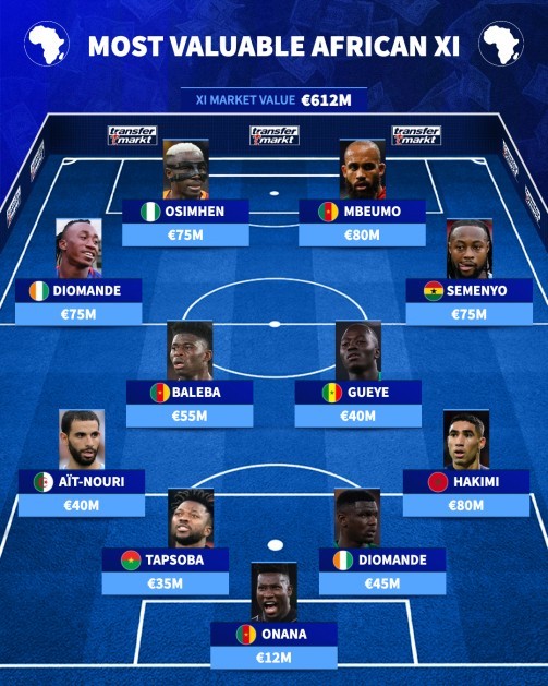 The goalkeeper for the African team is Cameroonian Onana (12 million euros). Burkina Faso defender Tapsoba (35 million euros) and Côte d'Ivoire's Osman Diomande (45 million euros) partner at center-back, Morocco's Hakimi (80 million euros) plays at right-back, and Algeria's Ait-Nouri (40 million euros) plays at left-back. The central midfielder positions are jointly filled by Cameroonian Baleba (55 million euros) and Senegalese midfielder Pape Gueye (40 million euros).